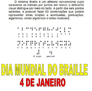 Assinala-se hoje, 4 de Janeiro, o «Dia Mundial do Braille», efeméride que pretende, acima de tudo chamar a atenção para os problemas dos cidadãos invisuais e da responsabilidade que a todos nos envolve nesta problemática, de modo próprio na construção de um mundo onde seja possível, cada vez mais e em cada dia, a sua integração e um não pleno à discriminação, dentro do princípio que foi campanha no ano prestes a findar «Igualdade de oportunidade para todos».