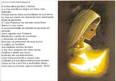 «A minha alma glorifica o Senhor e o meu espírito se alegra em Deus, meu Salvador, porque pôs os olhos na humildade da sua serva: de hoje em diante me chamarão bem-aventurada todas as gerações. O Todo-Poderoso fez em mim maravilhas: Santo é o seu nome. A sua misericórdia se estende de geração em geração sobre aqueles que O temem. Manifestou o poder do seu braço e dispersou os soberbos. Derrubou os poderosos de seus tronos e exaltou os humildes. Aos famintos encheu de bens e aos ricos despediu de mãos vazias. Acolheu a Israel, seu servo, lembrado da sua misericórdia, como tinha prometido a nossos pais, a Abraão e à sua descendência para sempre».